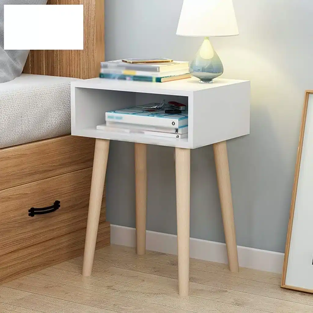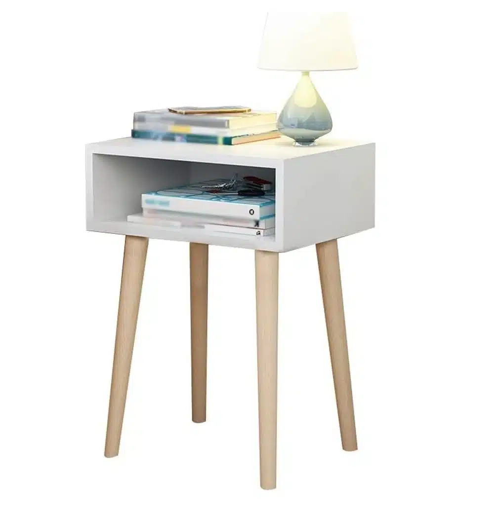 Table de nuit moderne avec pieds en bois naturel et rangement blanc. Compacte et élégante, elle offre un rangement pratique pour la chambre ou le salon.